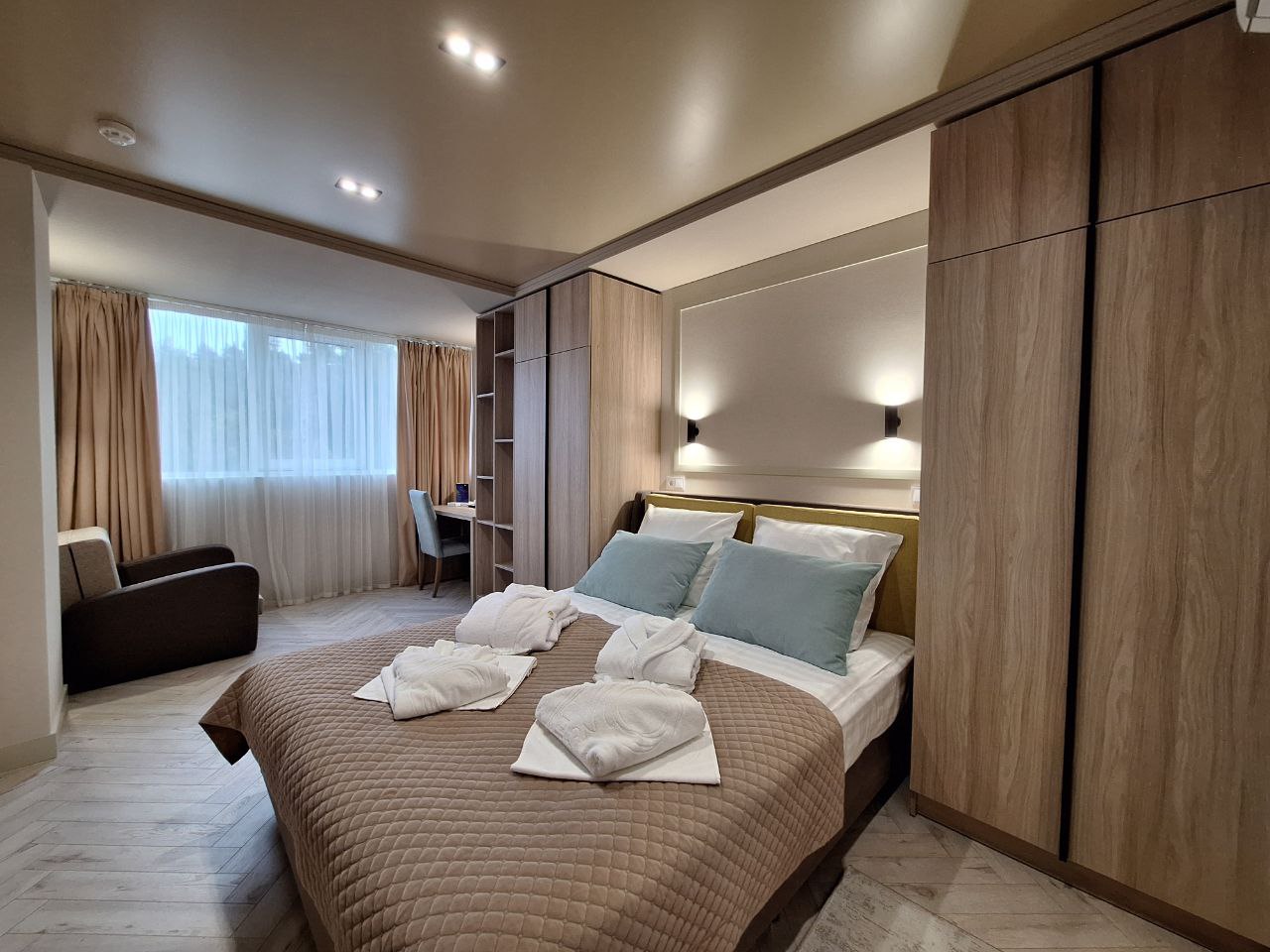 Гости проживают в двух семиэтажных корпусах: корпусе №1 «Приозерный» и корпусе №2 «Лазурный», которые соединены крытым переходом. Также гости размещаются в благоустроенных коттеджах и лесных домиках, расположенных в глубине территории. Все номера Стандарт, Doublе+ (от 14 кв.м), Супериор и Супериор + (16 кв.м), двухкомнатный Сюит (38 кв.м), трехкомнатный коттедж (48 кв.м) оформлены в спокойных, природных тонах и располагают: кондиционером (кроме номеров Стандарт и Супериор), телевизором, телефоном, мини-холодильником, чайником с набором посуды, ванной комнатой (фен, халат, тапочки, косметические принадлежности), WiFi. Часть номеров с балконом со столиком и стульями. Номера Сюит имеют спальню, гостиную и собственную террасу с шезлонгами и садовой мебелью с видом на хвойный лес.