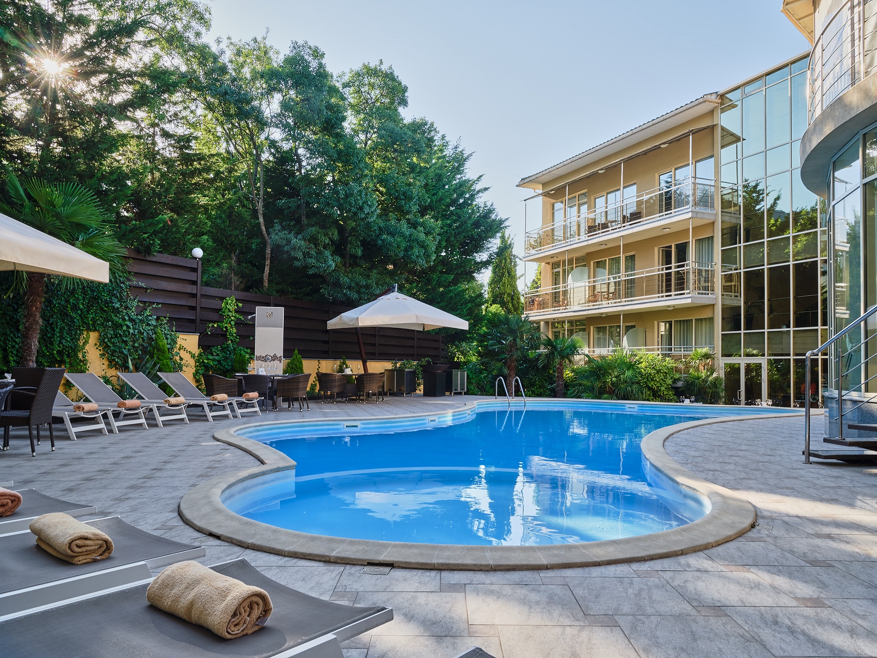 На территории отеля в теплое время года (с 1 июня по 30 сентября) работает бассейн без подогрева (9,7 х 5,5 м). Крытый бассейн с подогревом работает круглый год (+28ºС, 10,5 х 4).