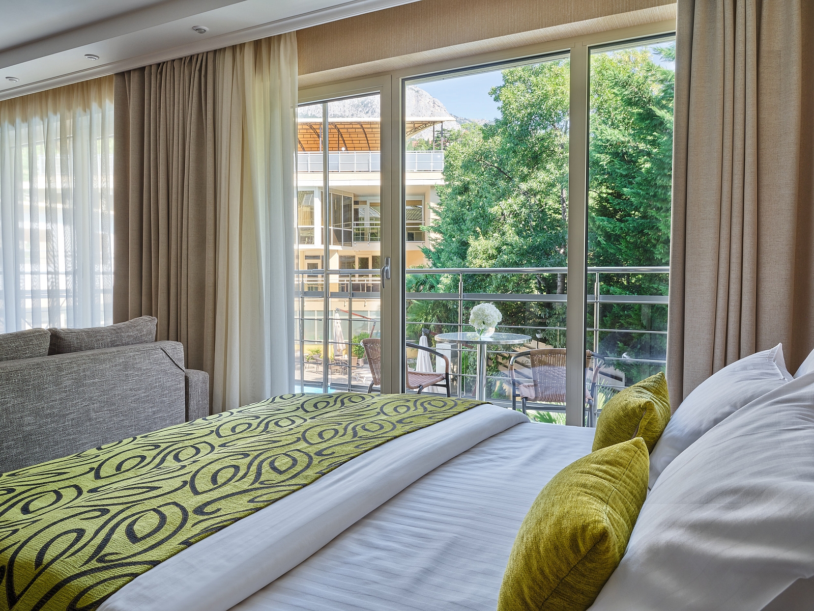 Номера с лаконичным интерьером, выдержанном в пастельных тонах, располагают: кондиционером, плазменным телевизором, сейфом, мини-баром, чайником, ванной комнатой (фен, халат, тапочки), Wi-Fi, балконом с видом во двор или на море. В номерах категории Люкс и Апартамент - дополнительно Мини-кухня.