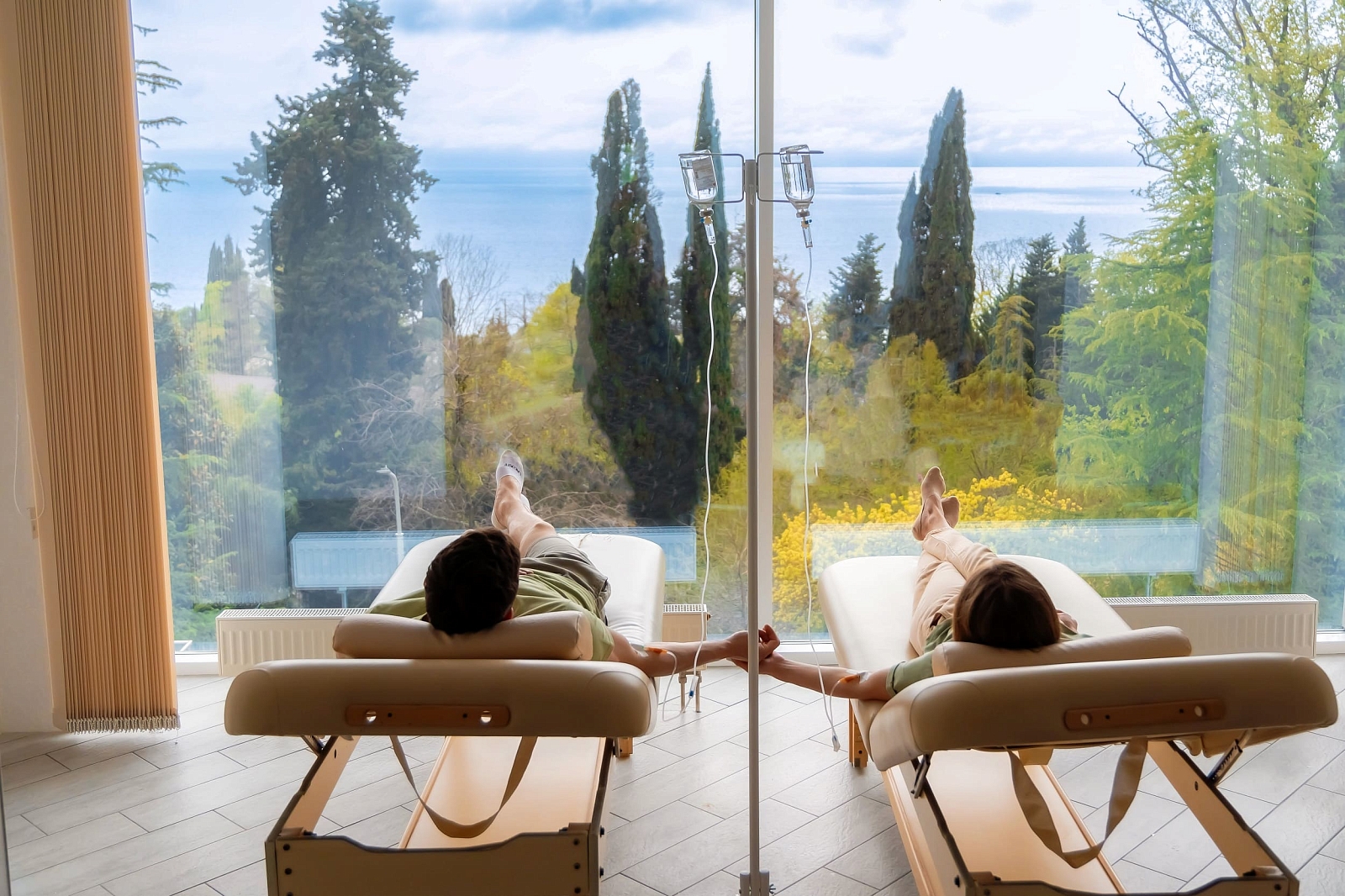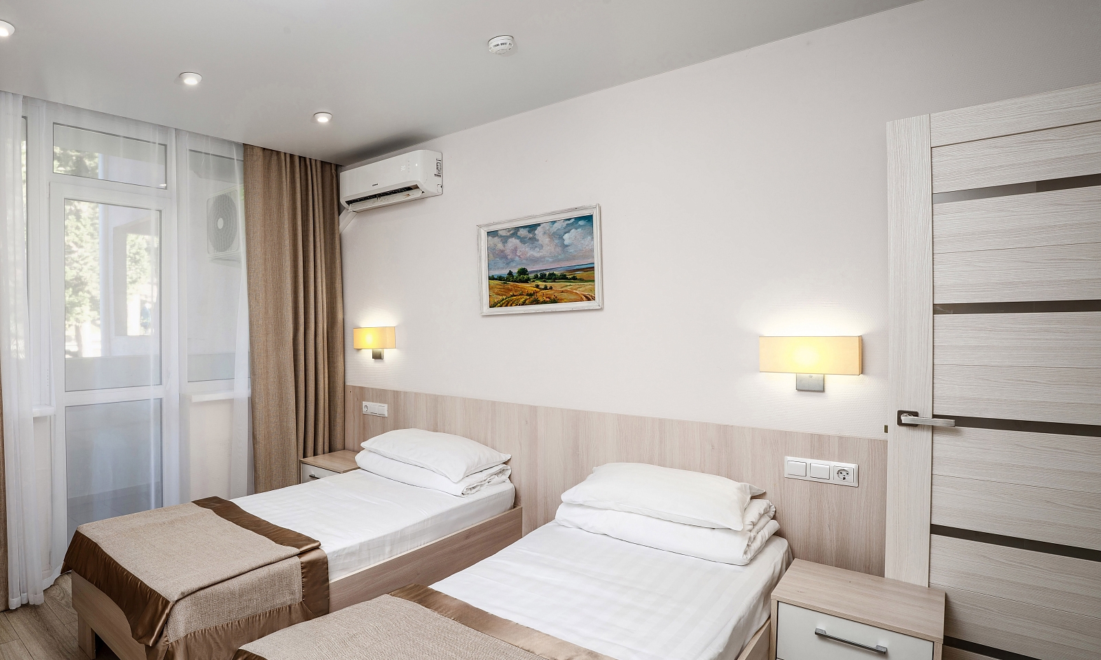 Всего в санатории 420 номеров категории Стандарт, двухкомнатный семейный Стандарт, Комфорт, двухкомнатный Семейный, двухкомнатный Апартамент, двухкомнатный Люкс. Во всех номерах есть кондиционер, телевизор, телефон, холодильник, ванная комната с феном, балкон с видом на парк или на море.